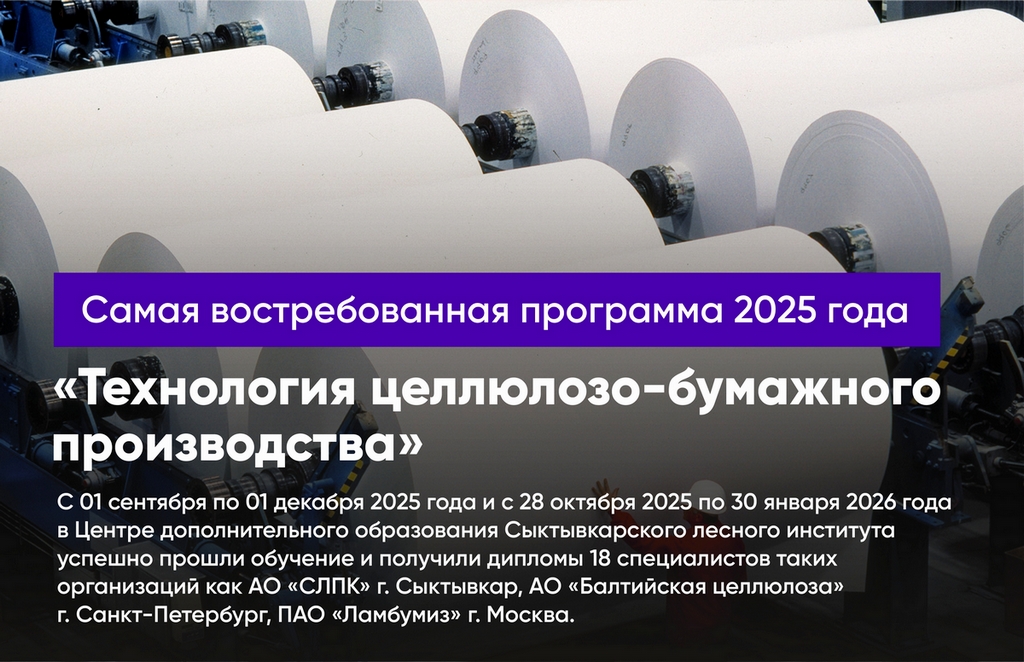 С 01 сентября по 01 декабря 2025 года и с 28 октября 2025 по 30 января 2026 года в Центре дополнительного образования Сыктывкарского лесного института успешно прошли обучение и получили дипломы 18 специалистов таких организаций как АО «СЛПК» г. Сыктывкар, АО «Балтийская целлюлоза» г. Санкт-Петербург, ПАО «Ламбумиз» г. Москва.